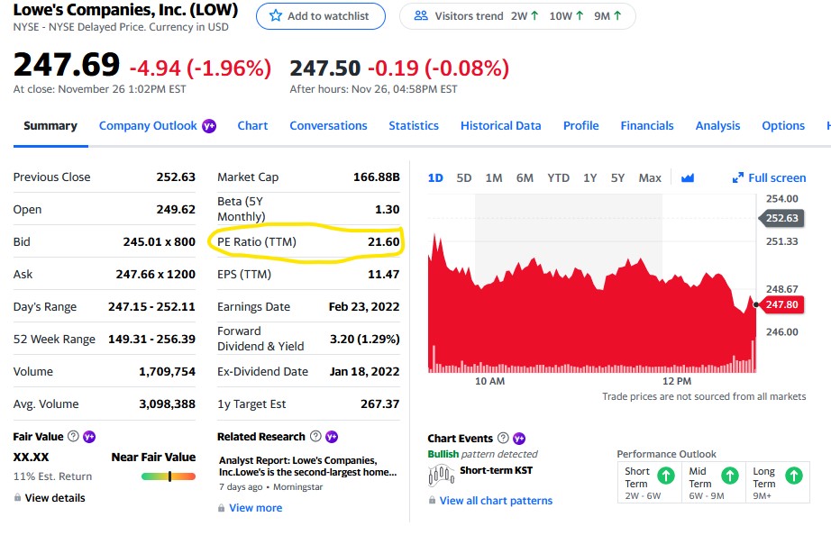 You will often hear people say what price they bough a stock at and that is fine, but only if they are talking in the right context. As firefighters, we value our experiences going to fires. They represent a accumulation of all we have trained and worked hard to achieve. Going to fires is still a source of pride. If I am out to breakfast with some of my academy mates and I tell them I have had 5 fires in the last month, it sounds great. If I tell them those 5 fires were part of a call volume of 500 calls that include a mix of traffic accidents, medical aids and other emergencies, it changes the perspective. Say another academy mate says he’s responded to 2 fires, but after doing a little digging, he states that their station has only had 100 calls total this month, he is getting 1 fire for every 50 emergencies and I am only responding to 1 fire for every 100 emergencies. If you value responding to fires, my friend is doing a heck of a lot better than myself. In stock investing, really take the time to learn fundamental analysis of the stock market. Again, get an account with TD Ameritrade and take advantage of some stellar free education. A simple fundamental analysis I use when looking at stocks is to use the P/E ratio. The P/E ratio is simply the stocks price divided by it’s earnings per share. It boils down to this, for every dollar I invest in a company a portion of that money will earn money. If a stock earns a lot compared to it’s price, its a better buy for me. Historically, stocks in various industries trade within a range of P/E ratios. If you are shopping around for stocks and comparing similar stocks, use the P/E ratio to determine which stock is actually cheaper. Ignore the price and look at P/E ratios in order to determine which is a better fit for your investing goals. Look at this example of Home Depot vs. Lowes. Home Depot is trading at 26.93 times earnings and Lowe’s is trading at 21.60 times earnings. In this moment in time, Lowes is both cheaper in price and in P/E ratio.