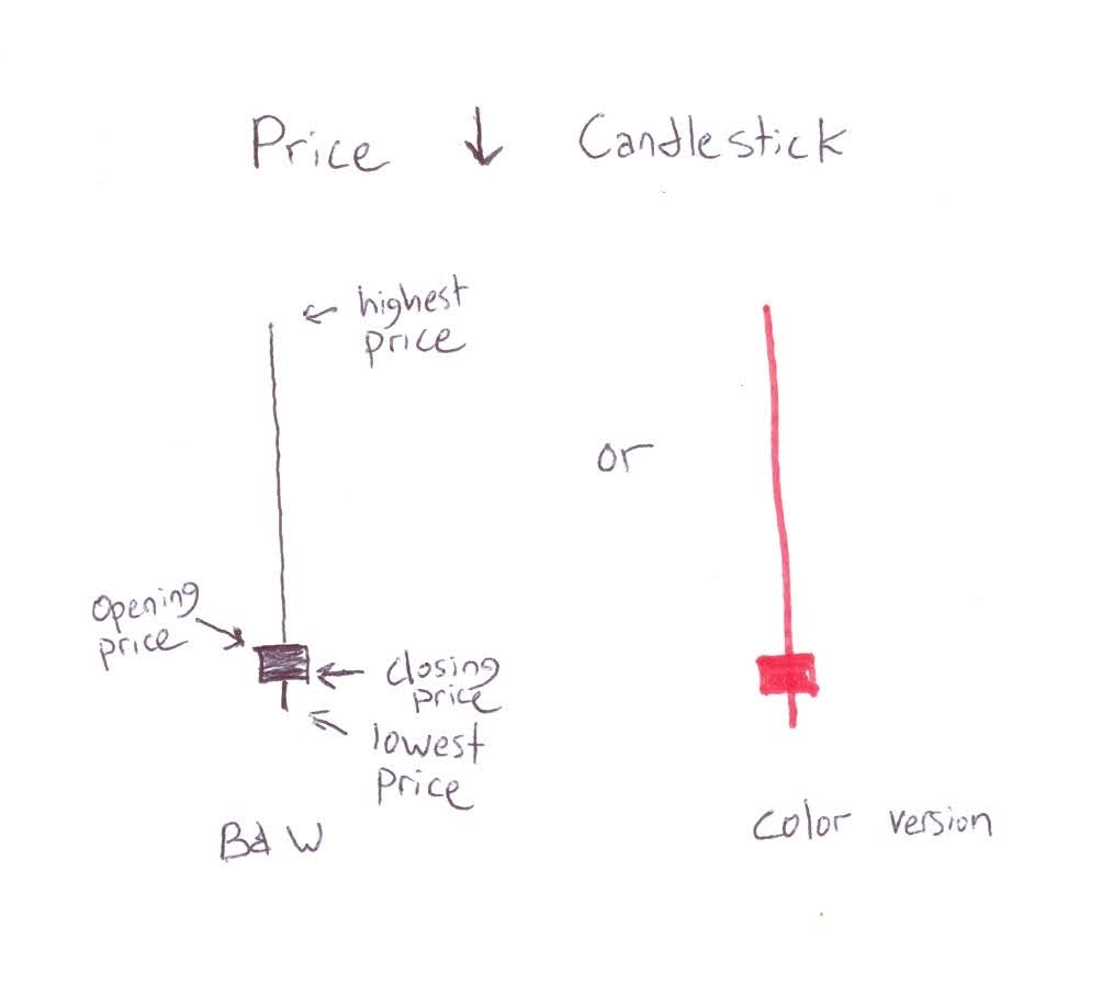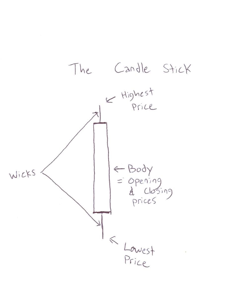 Candlesticks are comprised of bodies and wicks. The body is a box that represents the range between the opening price (the price when the time frame starts) and the closing price (the price when the time frame ends). The wicks, represent the extreme prices for the day. The upper wicks on top of the body represents the highest price the asset went to during that time frame. The lower wick is on the bottom of the body and represents the lowest price the asset went to during the time frame.