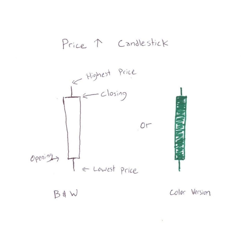 A candlestick pattern is a simply a visual reflection of an asset’s price during a time frame of your choosing. Instead of showing only the closing price, such as what you would see in a line chart, candlestick charts give you more information in a condensed form. Candlesticks can be applied to any time frame. The time frame can vary according to your investment time horizon. If you are looking to scalp options, meaning you want to be in and out of a trade in less than 15 minutes, you might look at one minute time frame candlesticks. If you want to buy and hold a stock for a decade, you may decide to look at weekly, monthly, or even yearly time frames. Candlestick charts are simply a quick visual representation of where the asset started, how low and how high it went, and where it ultimately landed when the time frame ended. One candlestick alone isn’t typically enough information to make a well informed investment decision. You rely on multiple candlesticks to be presented in chronological order (known as a candlestick chart) in order to see a more fleshed out picture of the price action of an asset. However, we need to crawl before we can walk and walk before before we can run, so here is the quick down and dirty of how to read a single candle stick.